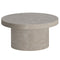 A sleek coffee table featuring a round table top for storage, a matt concrete look, and ample space for various items.