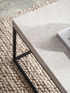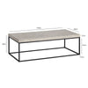 A large table top in a matte stone look provides ample space for various items, supported by a robust metal frame.