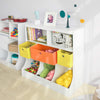 - Modern design children storage unit features two top shelves, three middle fabric drawers and three bottom storage compartments.