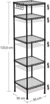 Rootz Bathroom rack - Storage rack - Shelving unit - 4/5 Levels - Steel - Black - Hooks - 30 x 30 x 123.5 cm